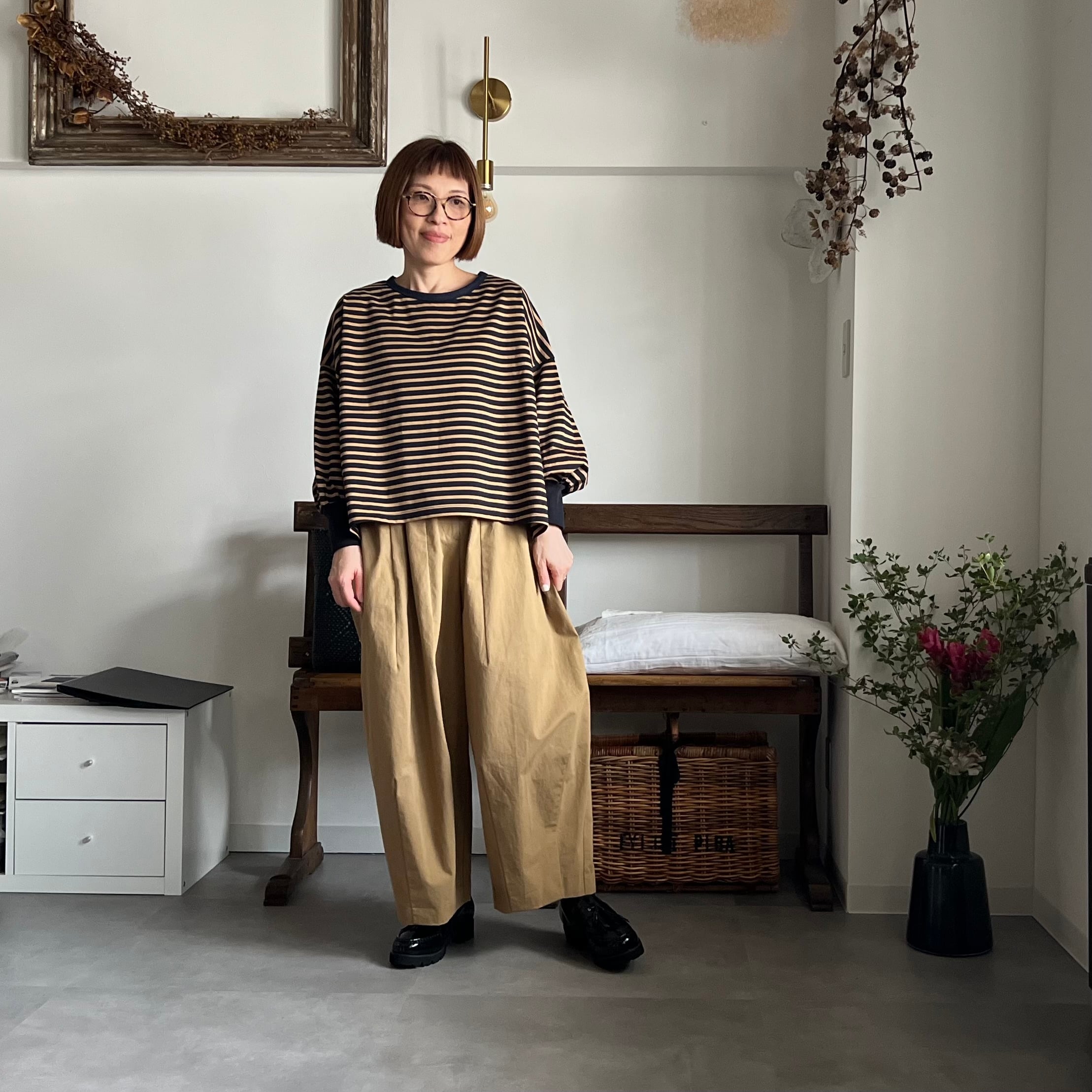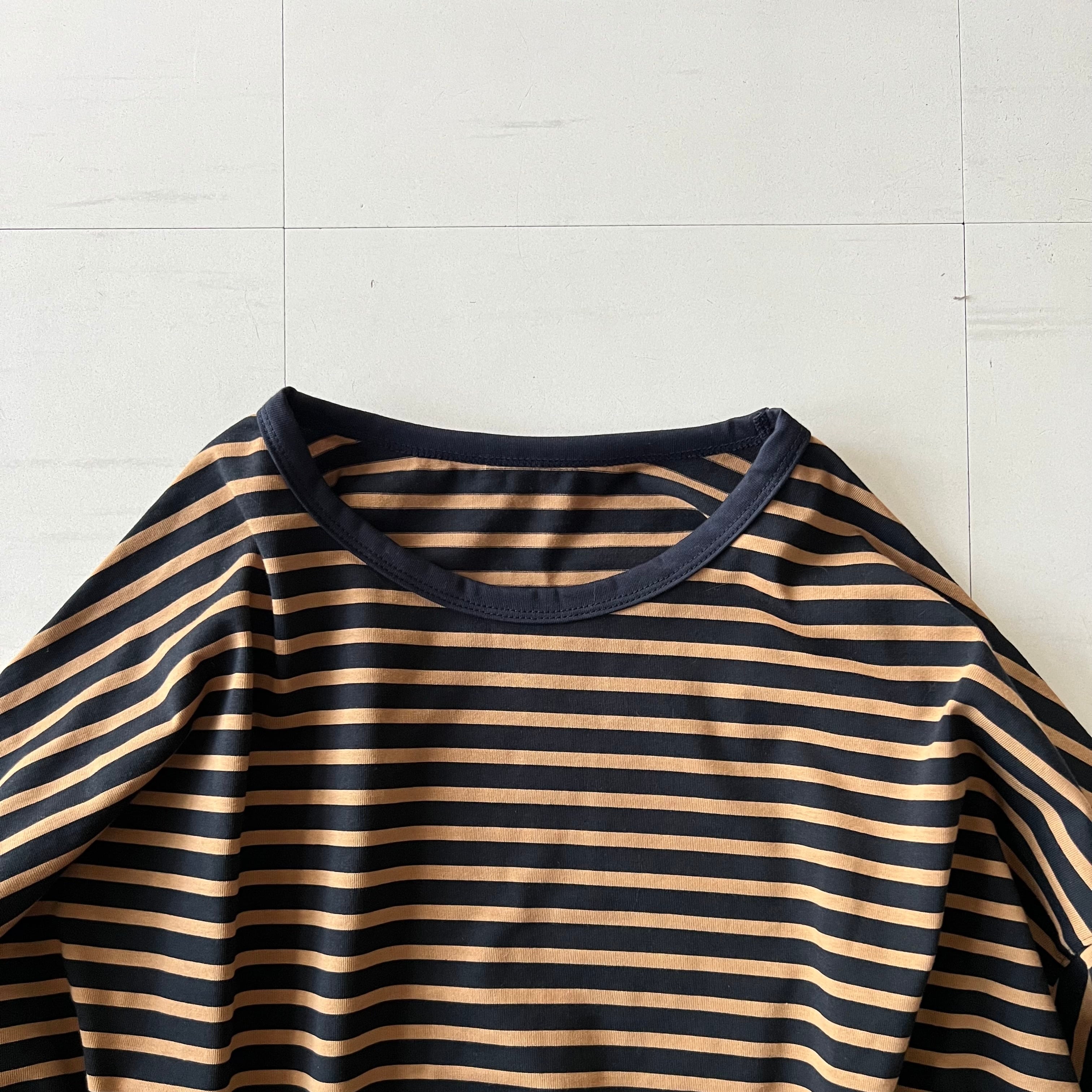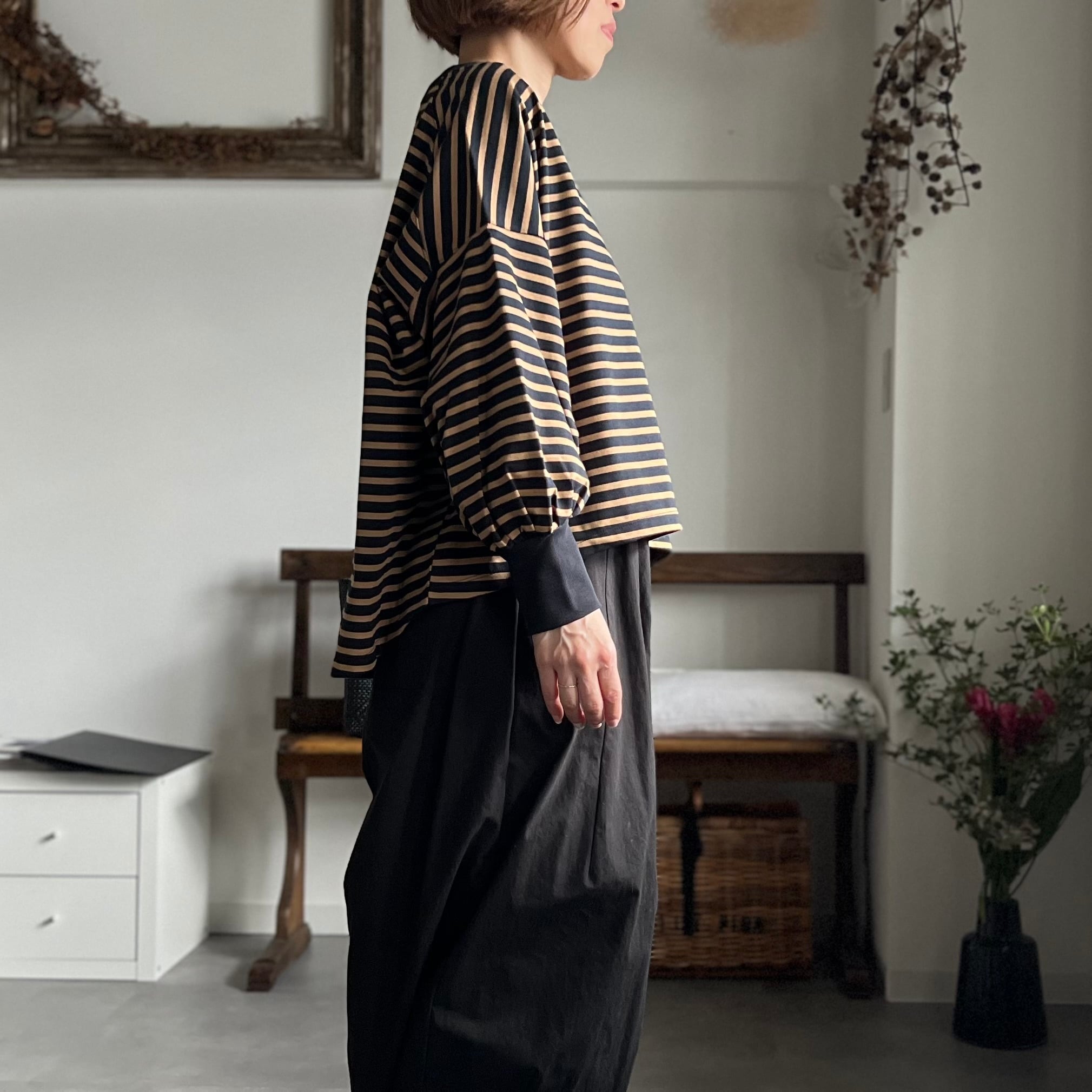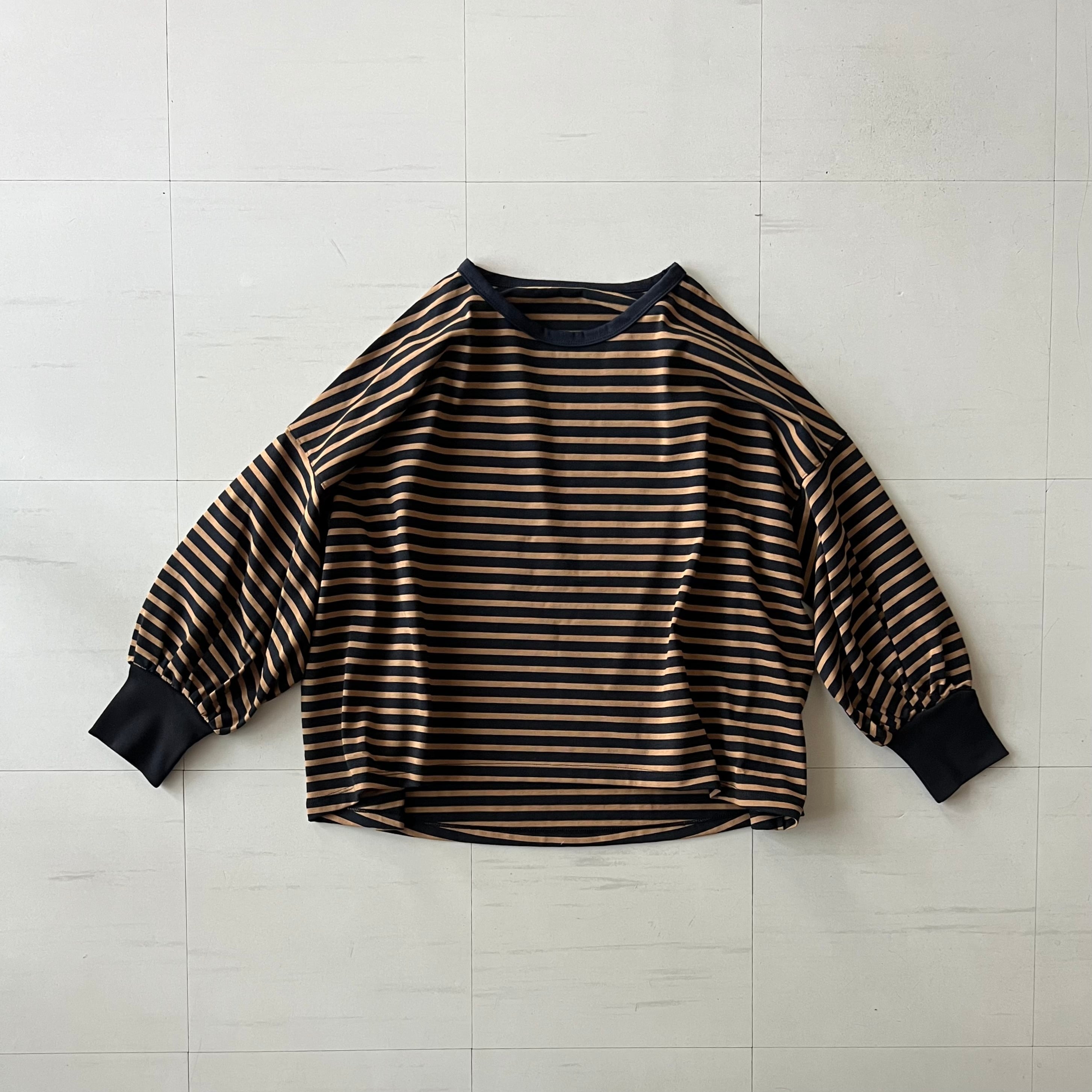 【k-198】 バルーン袖カットソーチュニック(NV×キャメルのボーダー)