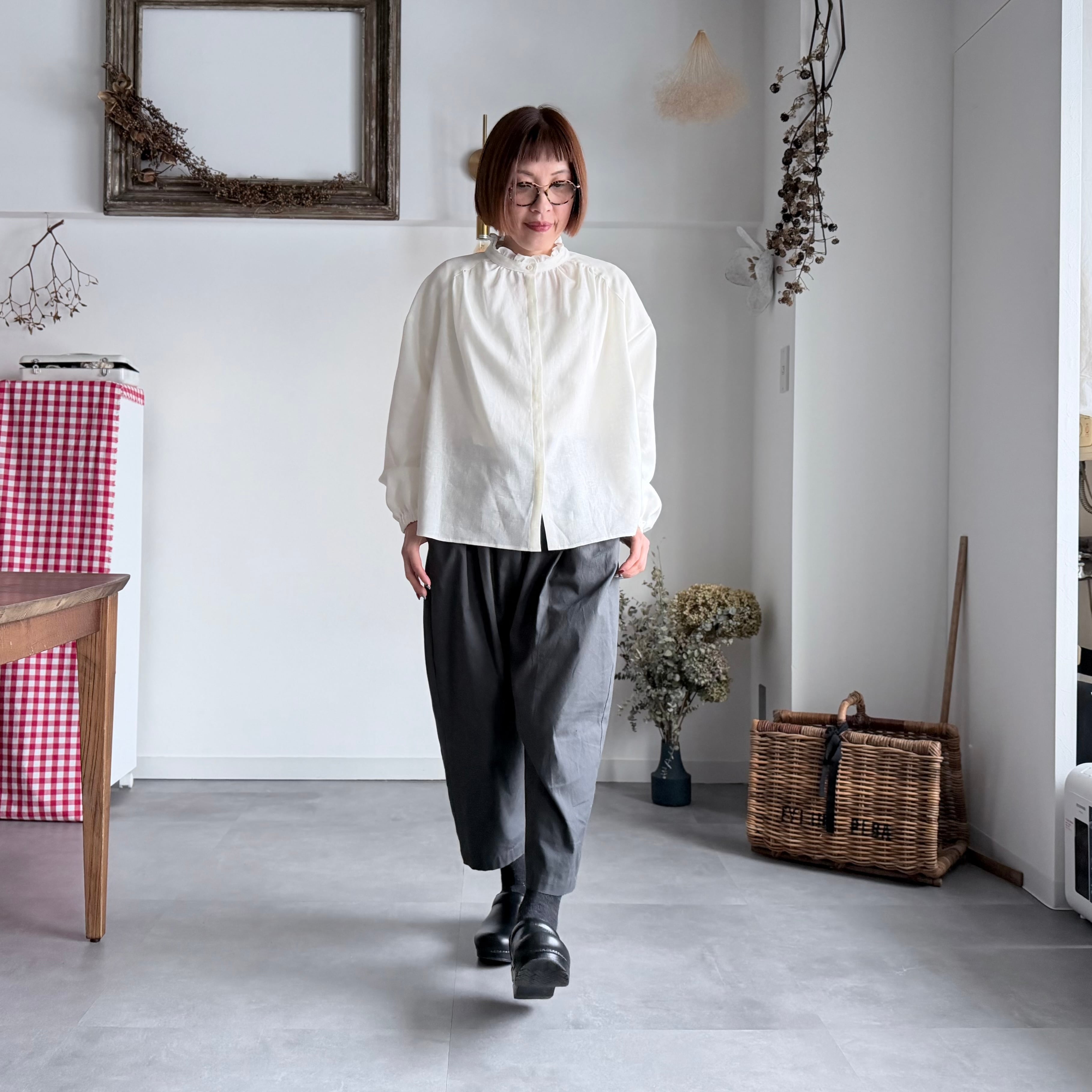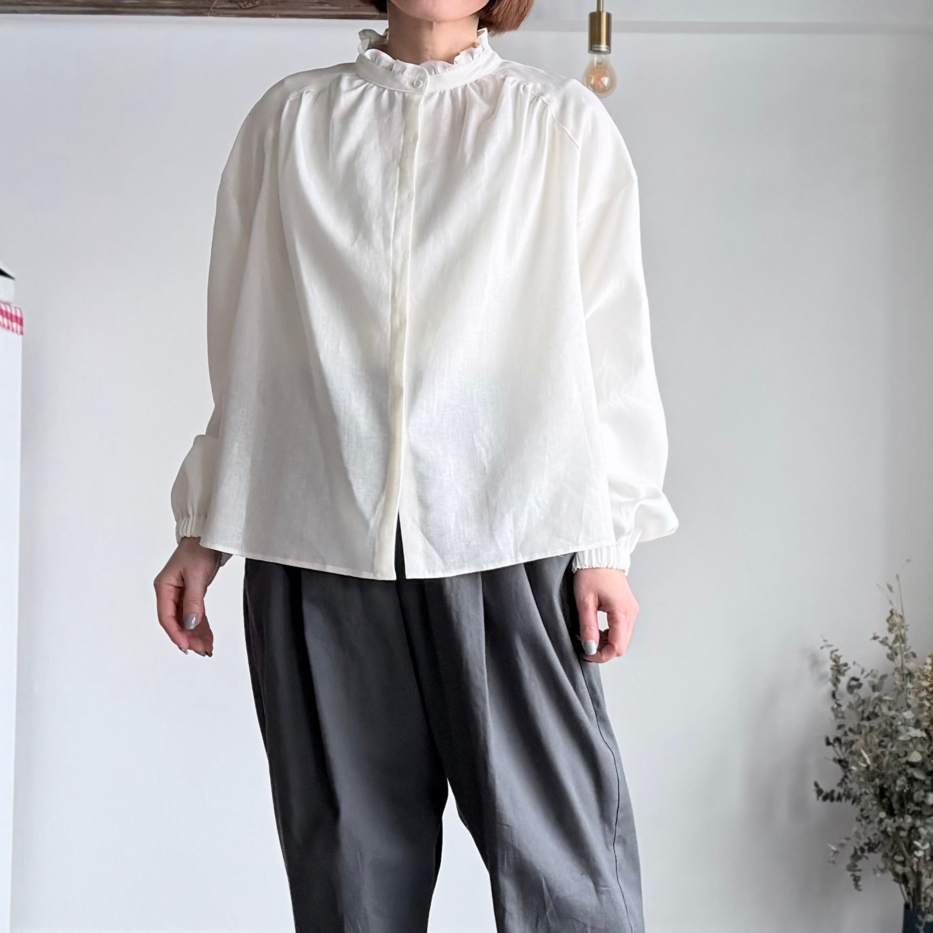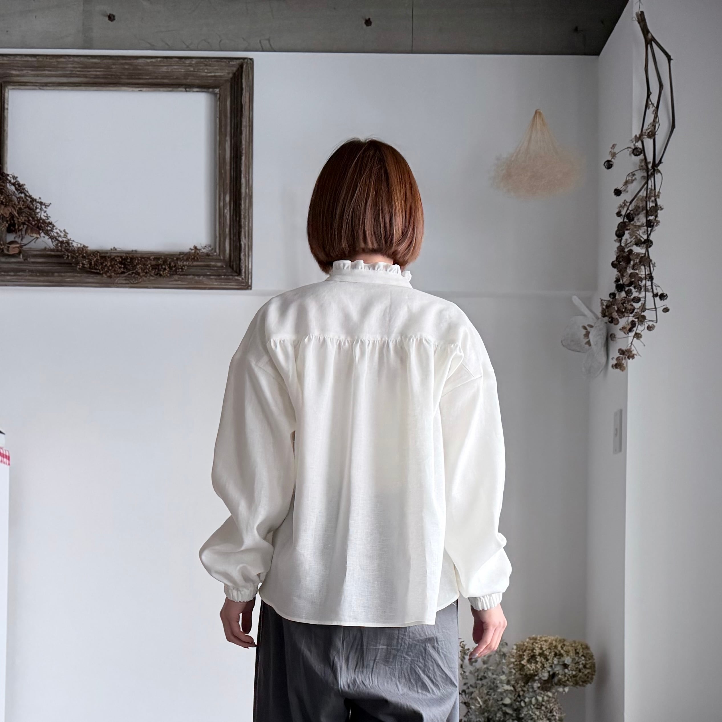 【k-106】バンドカラーフリルブラウス(アイボリー)